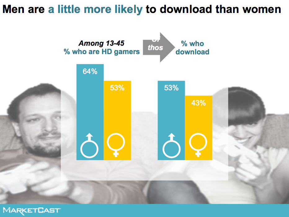 Among HD console owners, men are a bit more likely to download games, but women are not too far behind. The gap between men and women downloaders is fairly similar to the gap between men and women gamers overall.