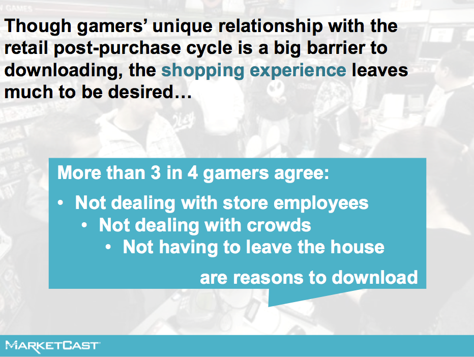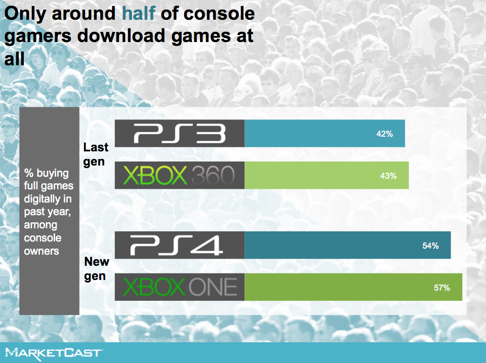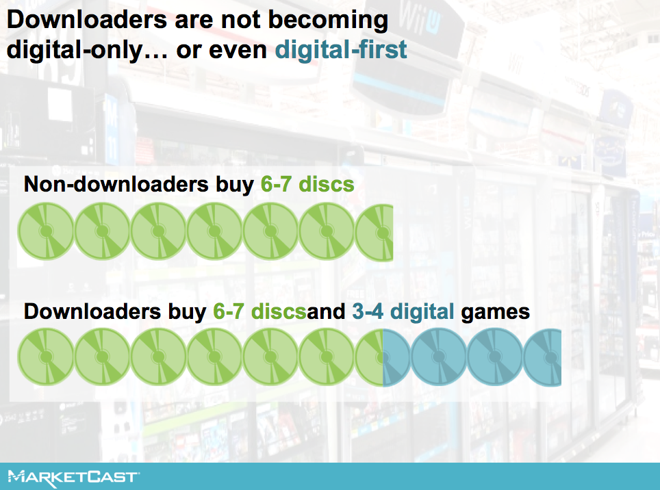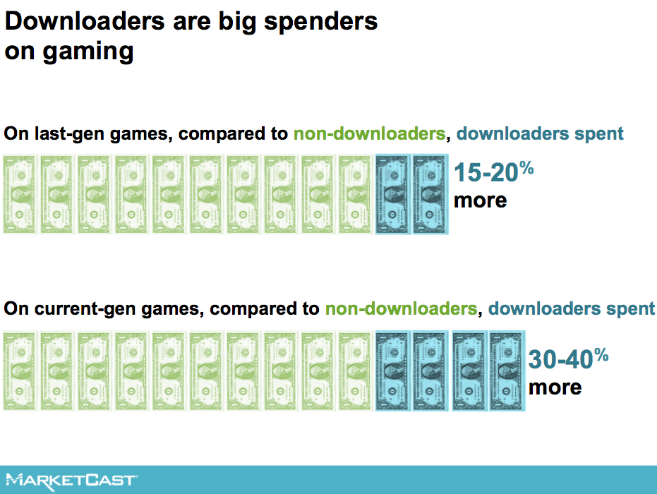 Compared to non-downloaders, gamers who buy games digitally spend 15-20% more on last-gen games for the Xbox 360 and PlayStation 3 overall. And they spend 30-40% more on games for current gen consoles.