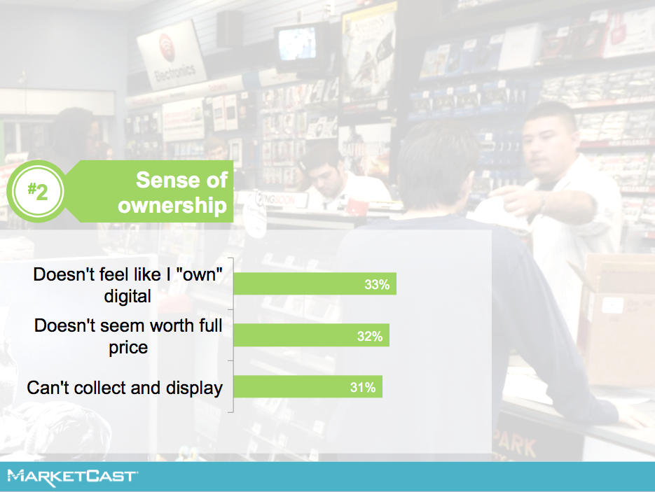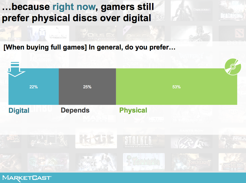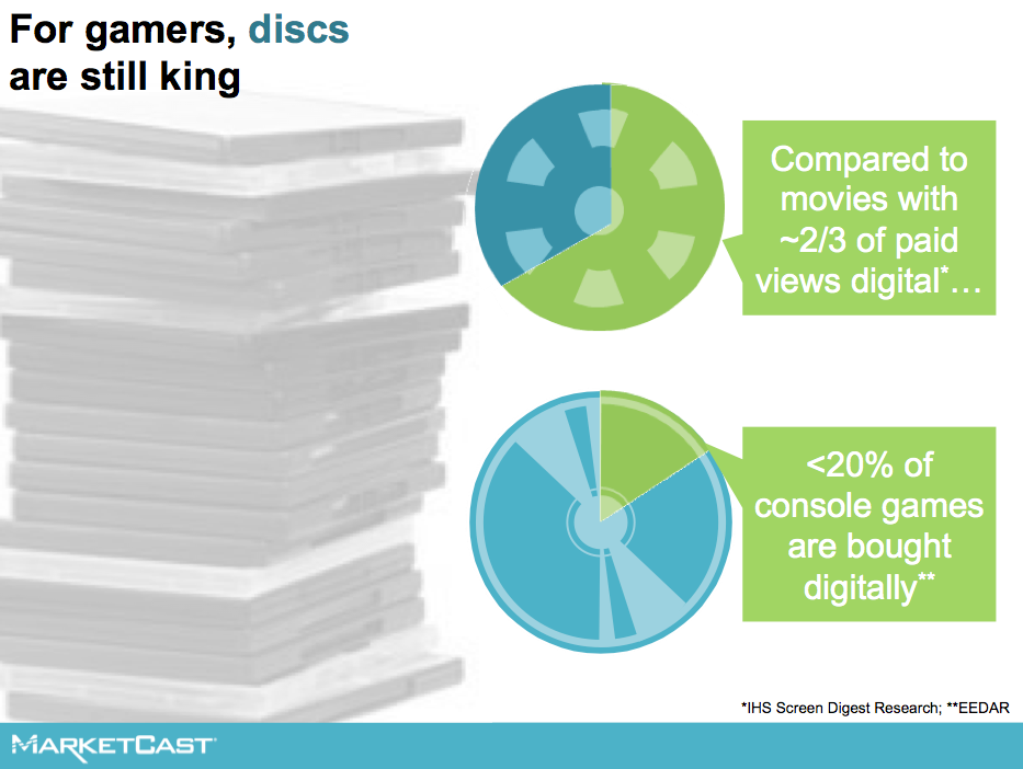Compared to around 2/3 of movies watched at home that are bought digitally, less than 1 in 5 console games purchased is a digital download. The majority are still bought via traditional physical discs.