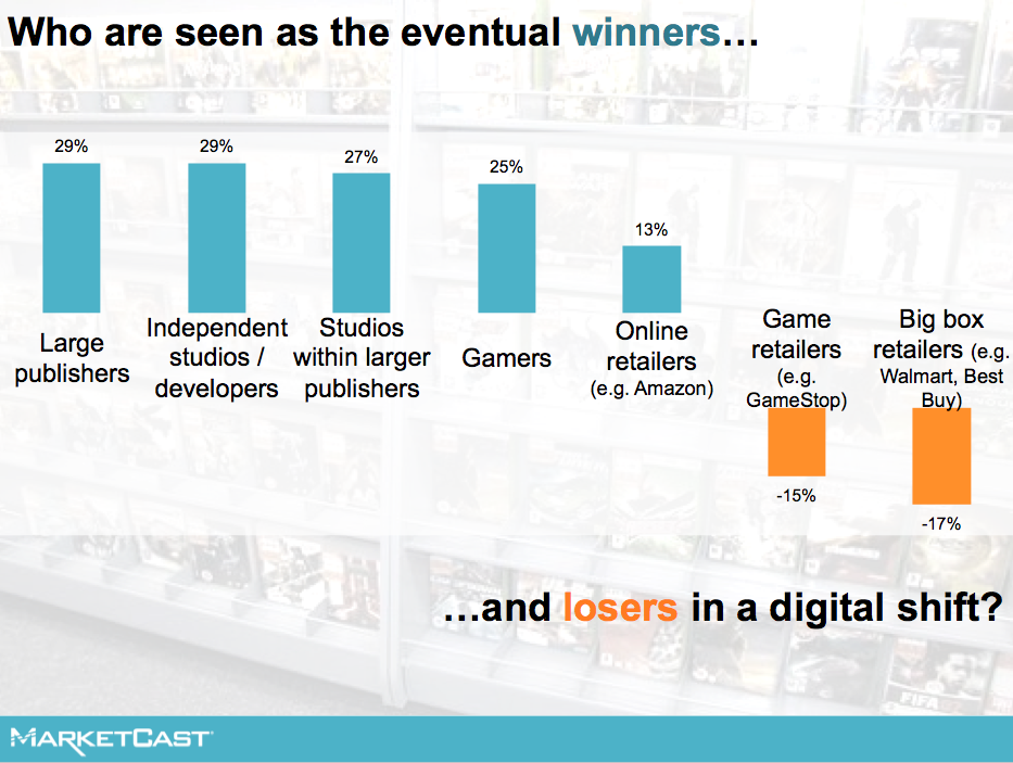 Virtually everyone wins except for the physical retailers. Gamers are optimistic that they will benefit from a digital shift in the long run, and they expect brick-and-mortar stores to be the only ones who really suffer.